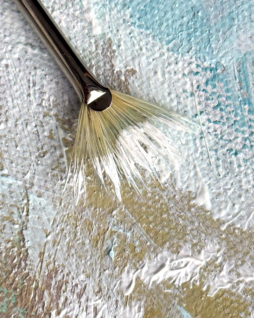 We recommend the fan brush for special effects and glazing. The Warhol’s Wife paintbrush is often used dry or with the hair tips loaded with ink, acrylic, oil or watercolour paint.