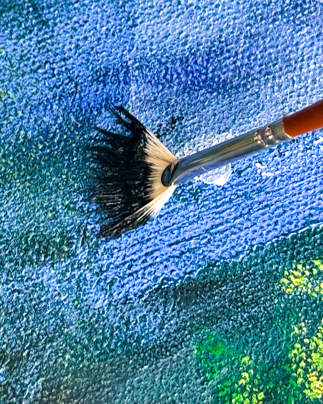The metal ferrule holds the hairs firmly in this shape. When wet, the hairs stay spread out and do not form a point. You can use Hog bristle fan paintbrushes on any surface: canvas, paper and timber panels. Each substrate will give you a different feel and look.