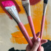 The brush has a 25-centimetre timber handle with a hand-applied crackle glaze in orange and salmon pink. This unique design adds a designer touch, offers a comfortable grip, and ensures long-lasting durability. Each handle is unique and finished with a strong nickel-plated brass ferrule. Every Pro Hart Swagger brush is individual—no two are the same.