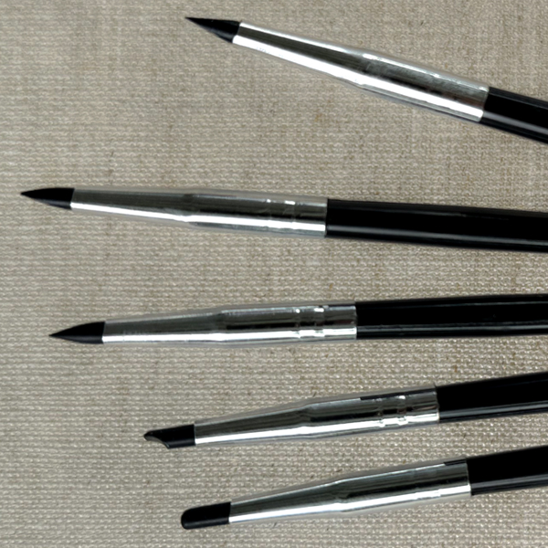 The 5-piece Warhol’s Wife silicone paintbrushes have assorted head shapes. The set includes a cup chisel, flat, flat round, sharp point and slanted point.